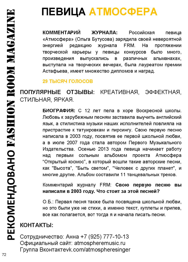 ![]() КОММЕНТАРИЙ ЖУРНАЛА: Российская певица «Атмосфера» (Ольга Бутусова) зарядила своей невероятной энергией редакцию журнала FRM. На протяжении творческой карьеры у певицы конкурсов было много, произведения выпускались в различных альманахах, выступала на творческих вечерах, была лауреатом премии Астафьева, имеет множество дипломов и наград. ![]() ПЕВИЦА АТМОСФЕРА, 29 ТЫСЯЧ ГОЛОСОВ ПОПУЛЯРНЫЕ ОТЗЫВЫ: КРЕАТИВНАЯ, ЭФФЕКТНАЯ, СТИЛЬНАЯ, ЯРКАЯ. БИОГРАФИЯ: С 12 лет пела в хоре Воскресной школы. Любовь к зарубежным песням заставила выучить английский язык, а стилистика музыки наших исполнителей повлияла на пристрастие к татуировкам и пирсингу. Свою первую песню написала в 2003 году, посвятив ее первой школьной любви, а в июле 2007 года стала автором Первого Музыкального Издательства. Осенью 2013 года певица начинает работу над первым сольным альбомом проекта Атмосфера “Открытый космос”, в который вошли такие авторские песни, как "Высота", "Быть светом", "Человек с других планет", и многие другие. Альбом составили 11 танцевальных треков. ![]() Комментарий журналу FRM: Свою первую песню вы написали в 2003 году. Что стоит за этой песней? О.Б.: Первая песня также была посвящена школьной любви, но это были уже не стихи, а именно текст, куплеты и припев, все как полагается, вот тогда я и начала писать песни. Читать журнал FRM можно здесь или здесь. |
